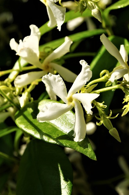 Le Jasmin étoilé ou Faux-Jasmin est une plante grimpante à feuillage persistant. Son aspect brillant est très esthétique même en hiver. Sa floraison blanche, à partir de mai et parfois jusqu’à l’automne, est particulièrement remarquable. Par sa luminosité d’abord mais aussi par son parfum entêtant proche du Jasmin officinal (mais ils n’ont pas de liens botaniques).